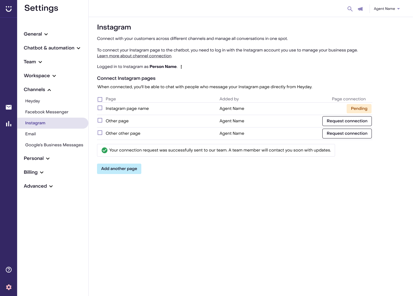 Our users needed a way to connect their Heyday Chatbot to social media accounts so they could manage customer conversations right from their Heyday inbox. But, they had to rely on customer success managers to make the connection, which often needed updates. User research showed us that this dependency was pretty frustrating for them—they wanted more control to make changes on their own. Plus, as part of our product-led growth (PLG) initiative, we wanted to give users more autonomy with tasks like this.
