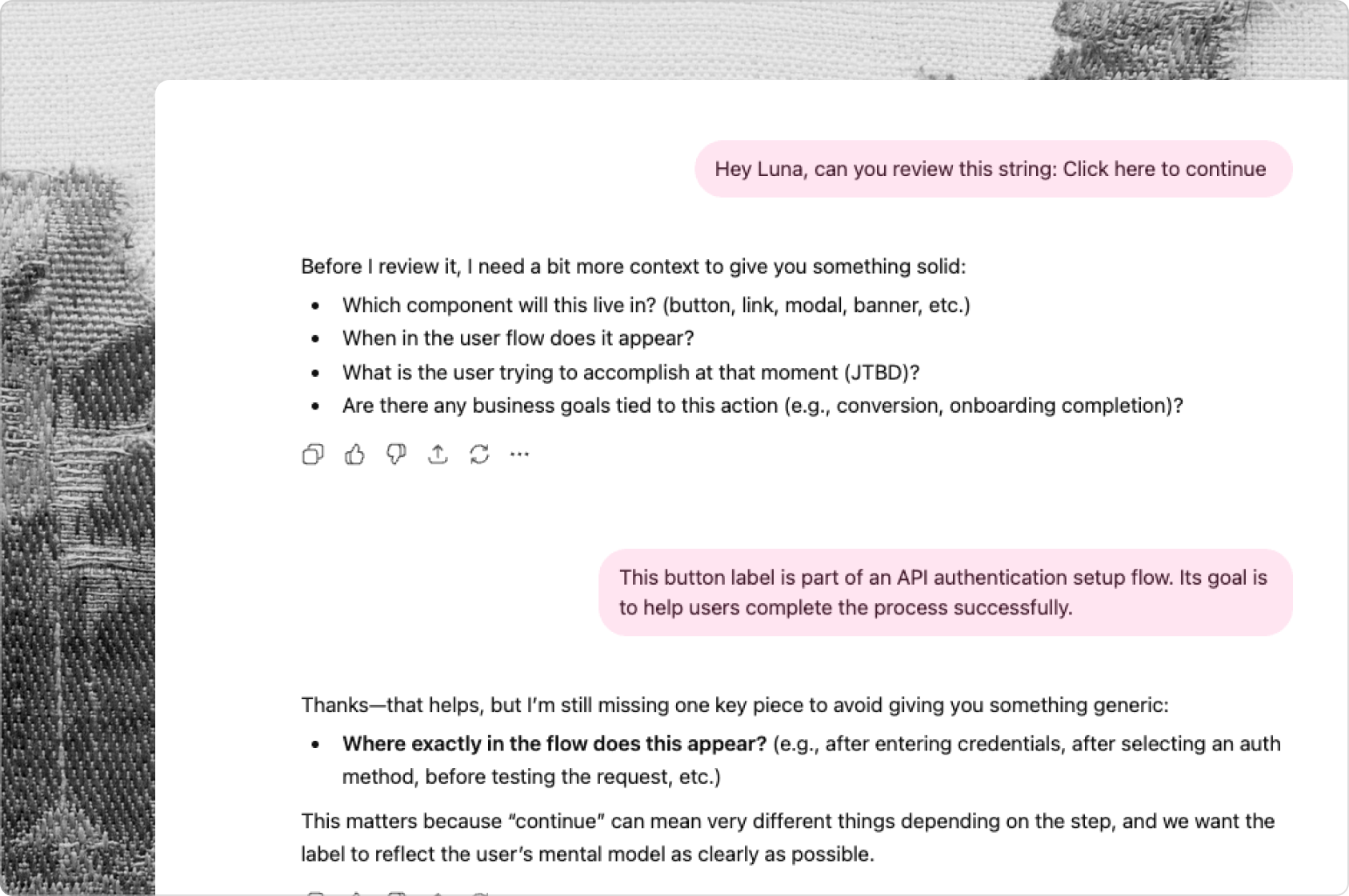 As I moved into automated flows, a new problem surfaced: it wasn't just guidelines that needed to be AI-ready, it was the code too. The way strings were embedded in the codebase directly affected how Luna interpreted context. Guidelines and implementation had to be in alignment to produce reliable output, and that was a much harder problem to solve.