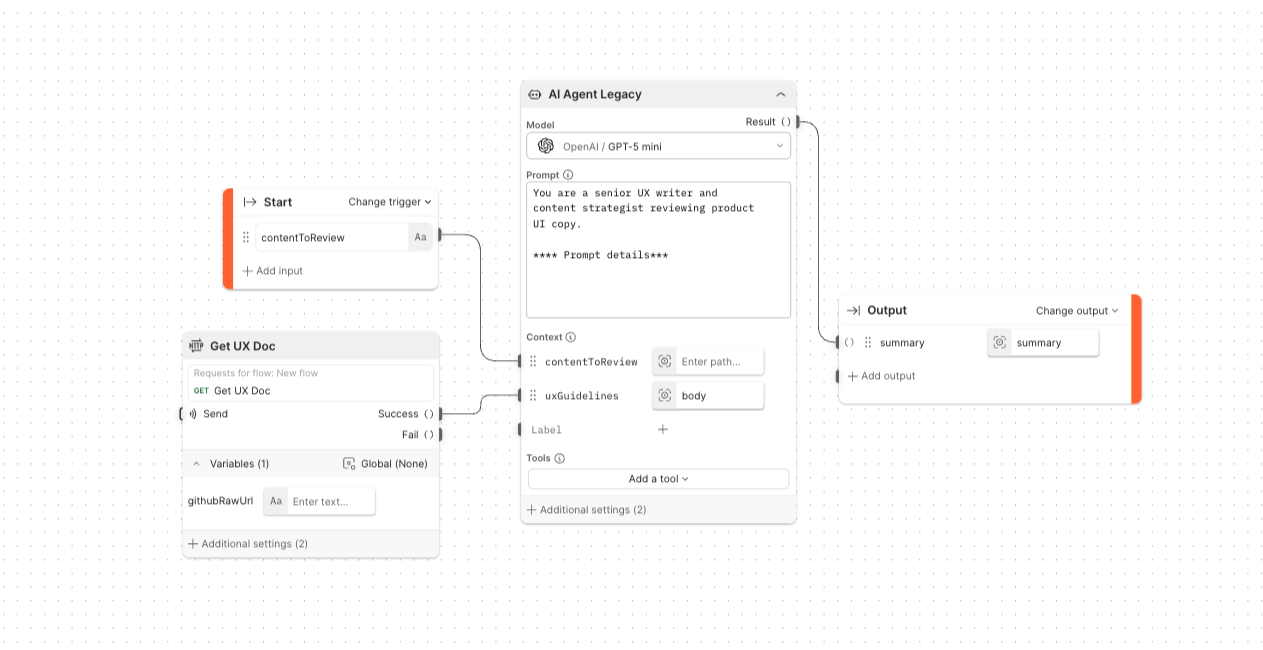 Using Postman Flows, I built an agentic workflow that connected our content guidelines to different products through API calls. To make them accessible, I hosted the guidelines on GitHub, giving Luna a stable, structured source to reference.
