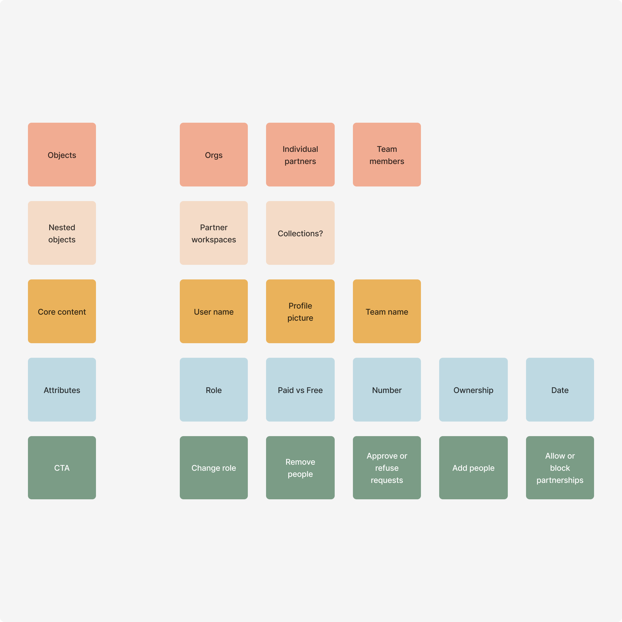 Using the OOUX method, I mapped the key elements involved in partnership management across the product. I broke down the concept into the objects, people, actions, and attributes shaping the admin experience, including entities like organizations, teams, internal members, external partners, and partner workspaces, with attributes like role, ownership, and access level.